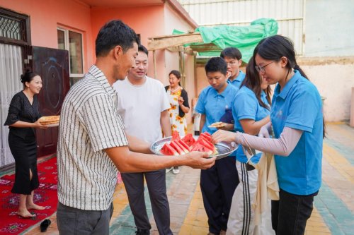 “欢迎你们回家!”农户夫妇见到实践队员格外亲切,当即取出刚出炉的芝麻馕、皮芽子馕热情款待,还端出自家种植的甜西瓜与队员们分享,庭院中欢声笑语不断,暖意融融。交流中,实践队员向农户夫妇学习了馕文化历史渊源与传统制作流程,从面团发酵、馅料调配到馕坑烤制的每道工序都细致观摩、动手体验,深刻感受新疆传统手工艺的文化魅力。临别时,农户夫妇特意准备了印有花纹的特色馕饼作为回礼,双方在互赠礼物中传递着跨越千里的真挚情谊。