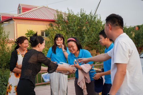 图为临别时农户向实践队员赠送馕饼场景 胡清华摄
